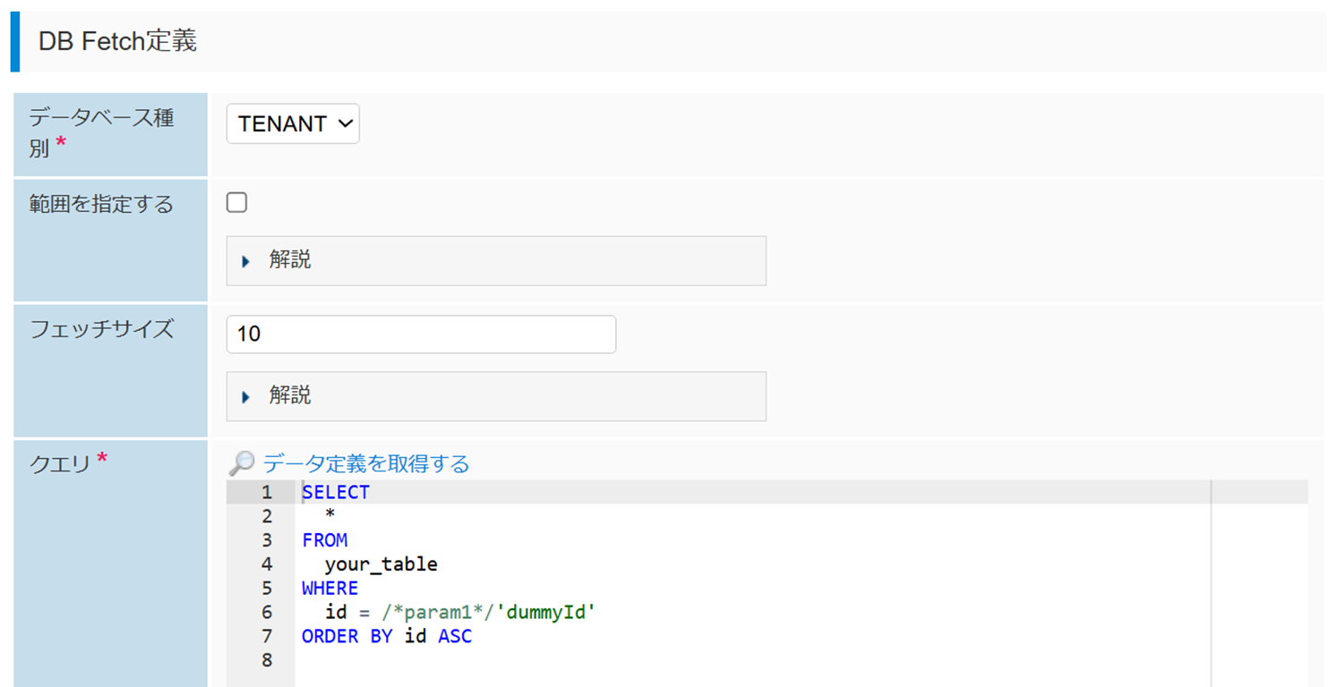 - データベース種別に応じて必要な項目(範囲指定やフェッチサイズ)を設定