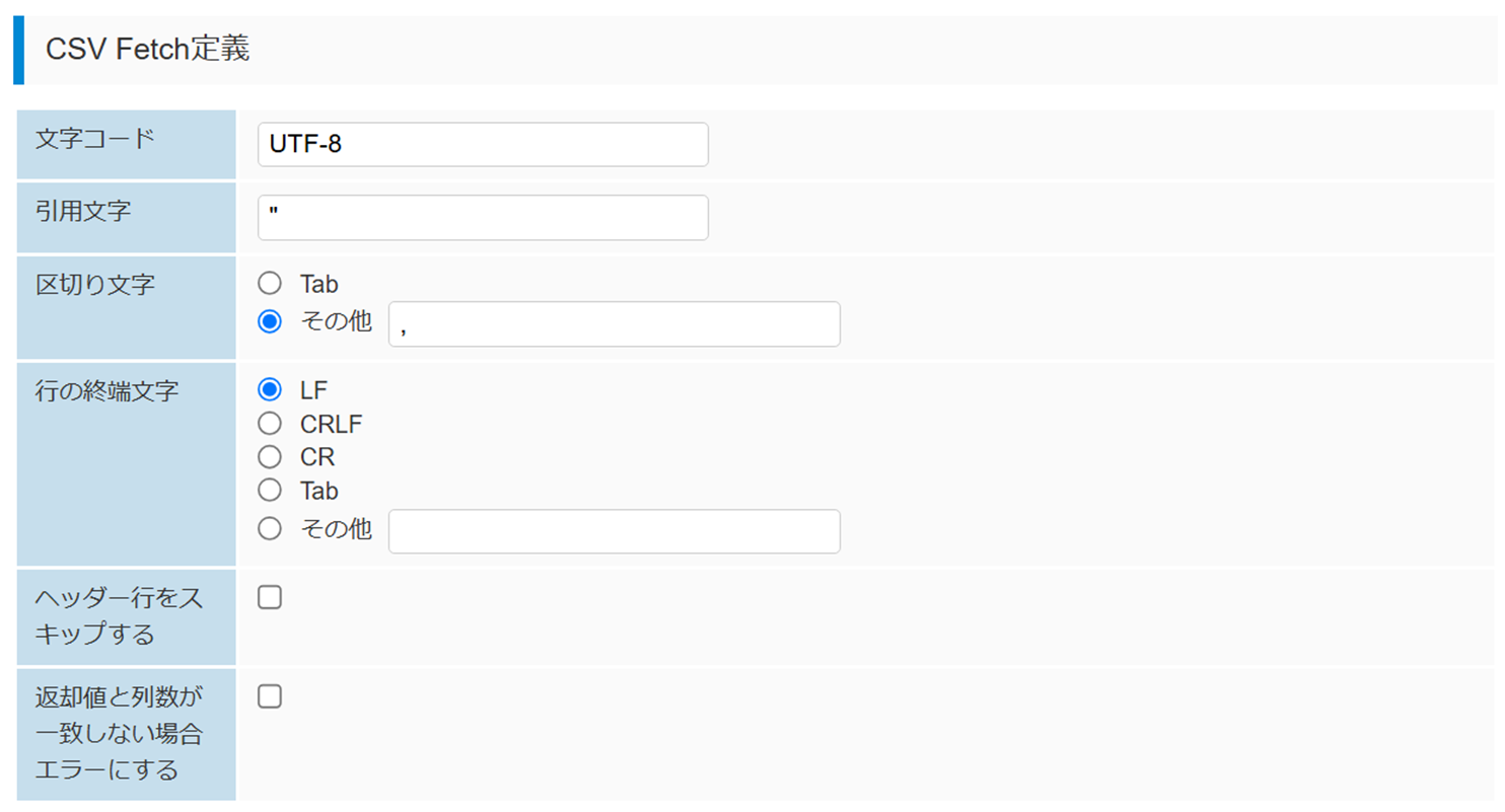 - 1レコードごとの終端文字(LF, CRLF, CR, Tab, その他)を指定