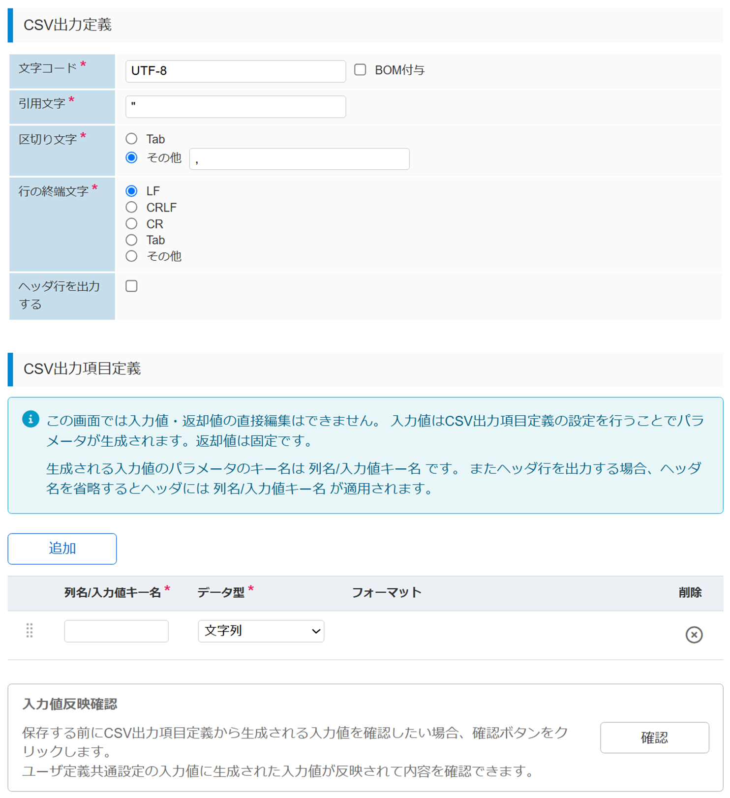 「CSV出力定義」と「CSV出力項目定義」を設定します。