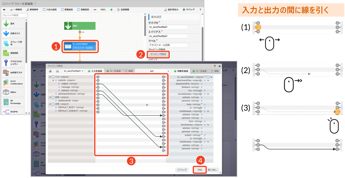 エレメント間のデータのやり取りを定義するために、エレメントごとにマッピングを設定していきます。