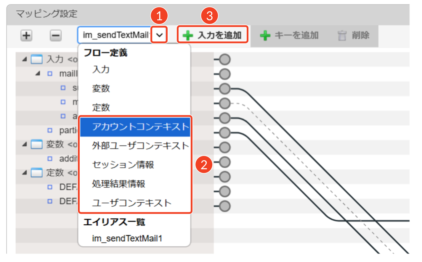 エイリアス一覧には、ロジックフローのプロパティで設定された各エレメントのエイリアスが表示されます。エイリアスを設定することで、マッピング時に特定のエレメントの処理結果を簡潔に参照できるようになります。詳細は、「IM-LogicDesigner仕様書 - 4.1.5.2. エイリアス」を参照してください。