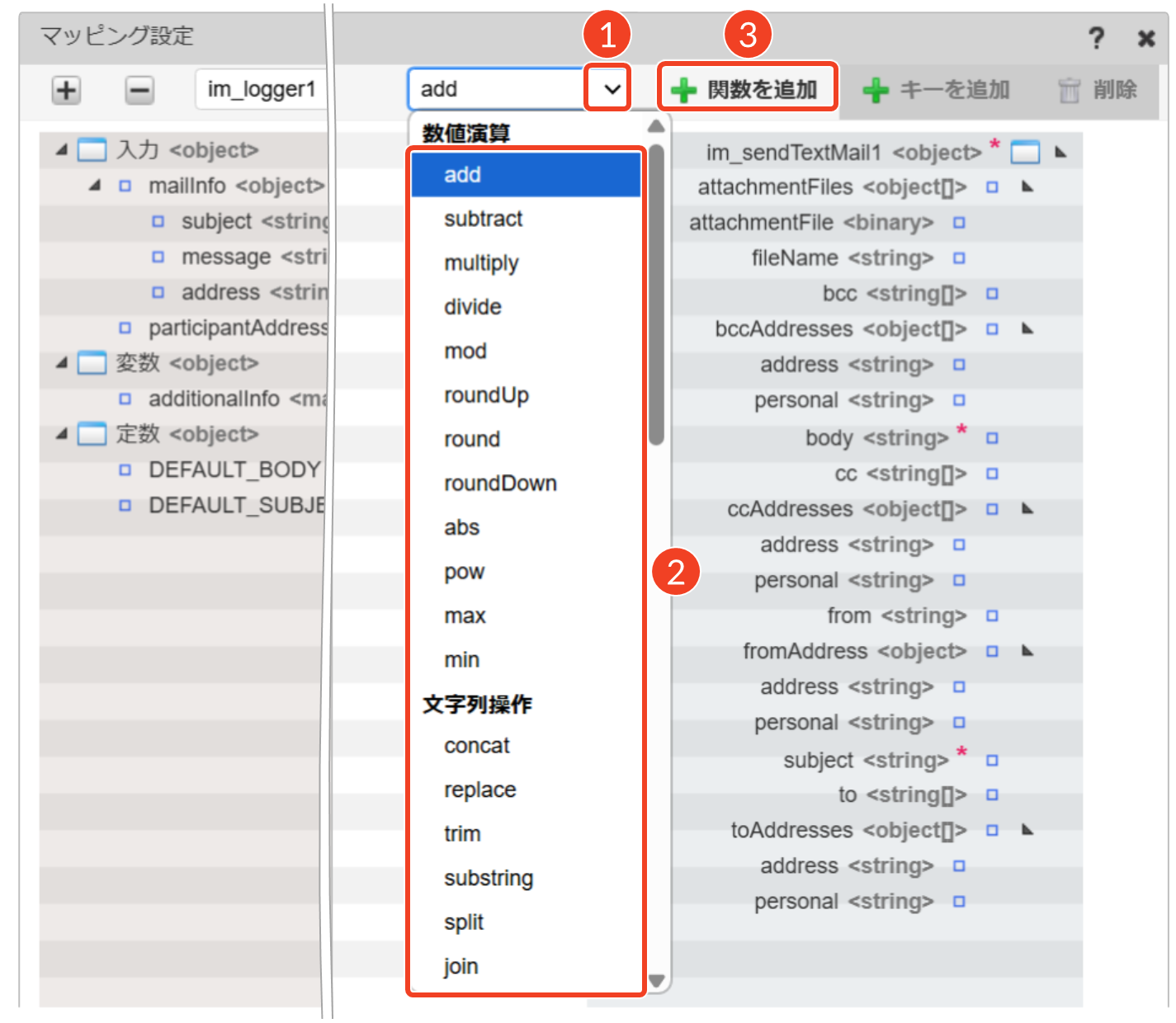 マッピング設定では、前のエレメントからの出力値に対して、マッピング関数を使った演算処理を行い、その結果をそのまま次のエレメントへの入力値に渡すことができます。この関数を利用することで、ロジックフローで新たな処理タスクを追加せずに、マッピング設定だけで処理を完結させることができます。