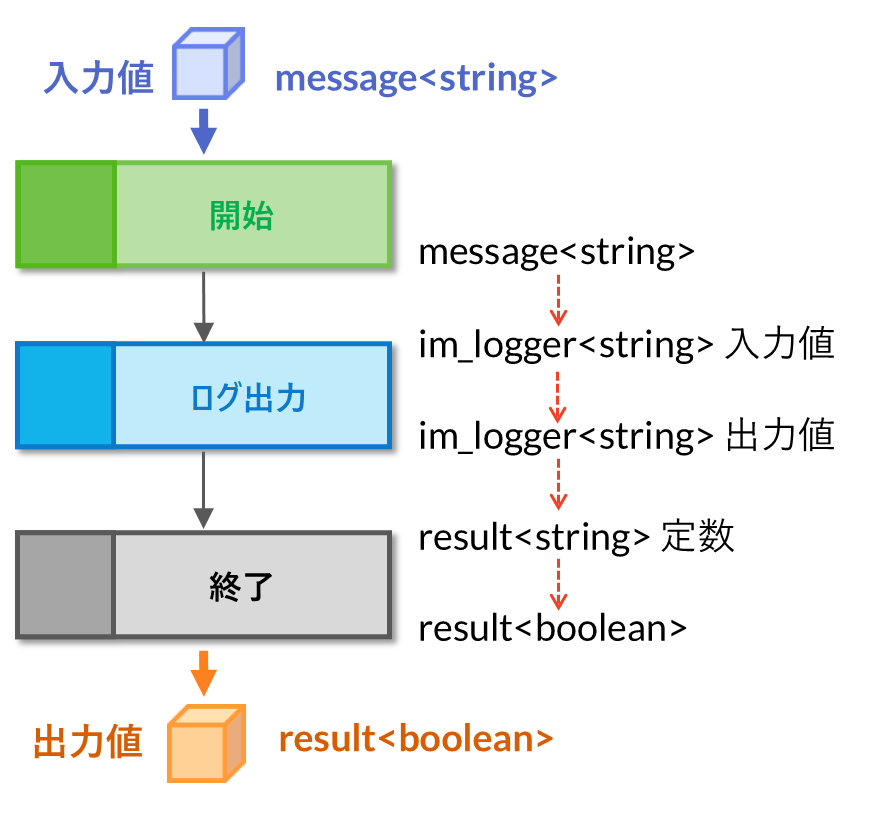 たとえば、コンソールへのログの文章を入力値として定義し、ロジックが正常に実行したことを示すフラグを出力値として定義します。この場合、それぞれに適切なデータ型(例:ログは文字列型、フラグは真偽値型)を指定しておくことで、データの整合性を保ち、意図しない型のデータが渡されることを防ぐことができます。