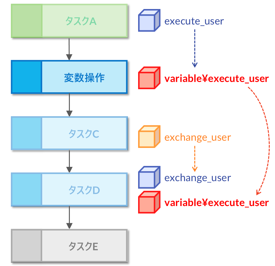 - 後続処理(タスクD)で、タスクCで取得したユーザ情報と、変数に格納しておいた実行ユーザ情報を両方利用