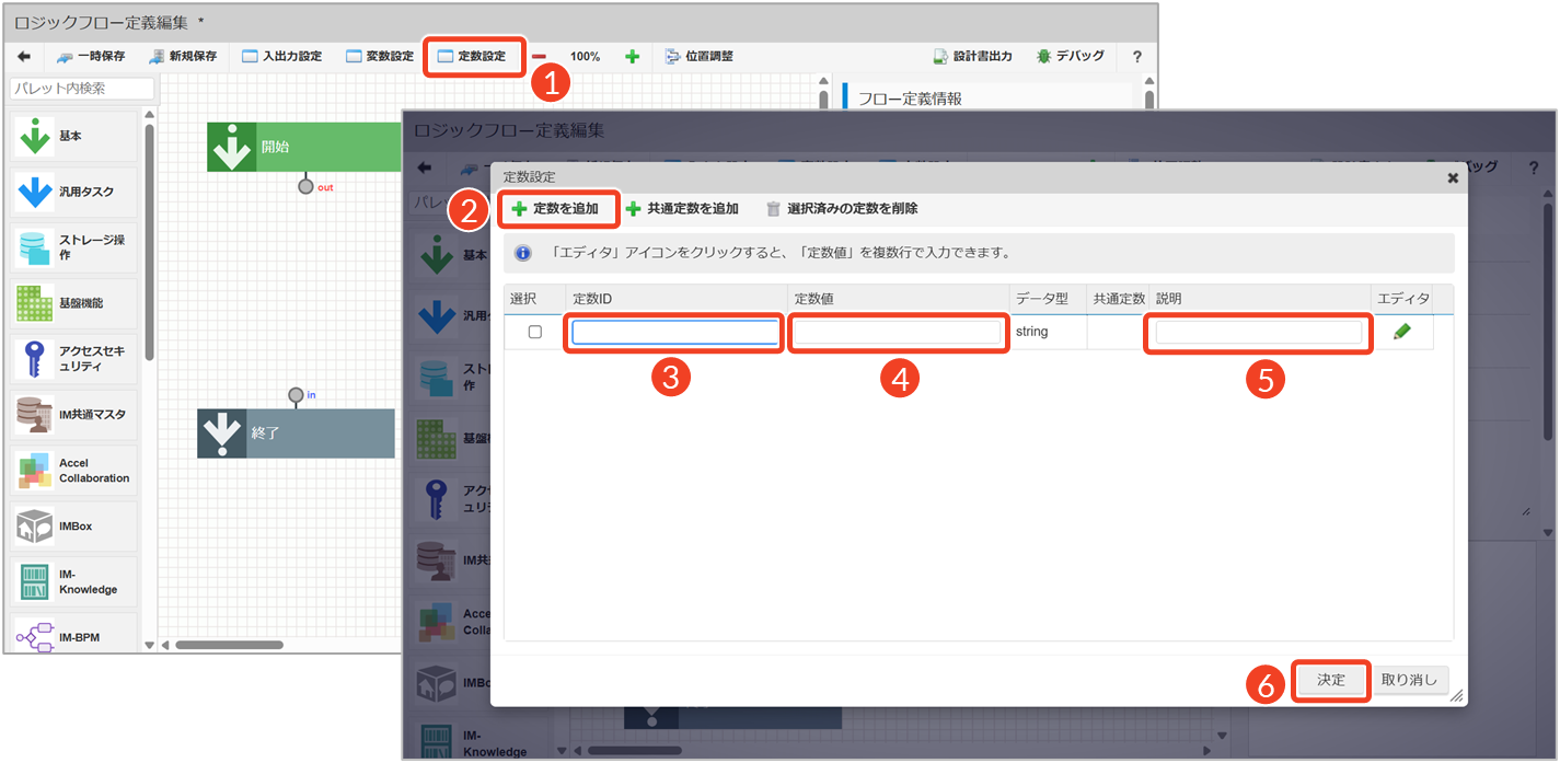 - 設定に進む前に定数設定の概要を確認したい場合は、「入出力値・変数・定数の定義 > 定数設定とは」を参照してください。