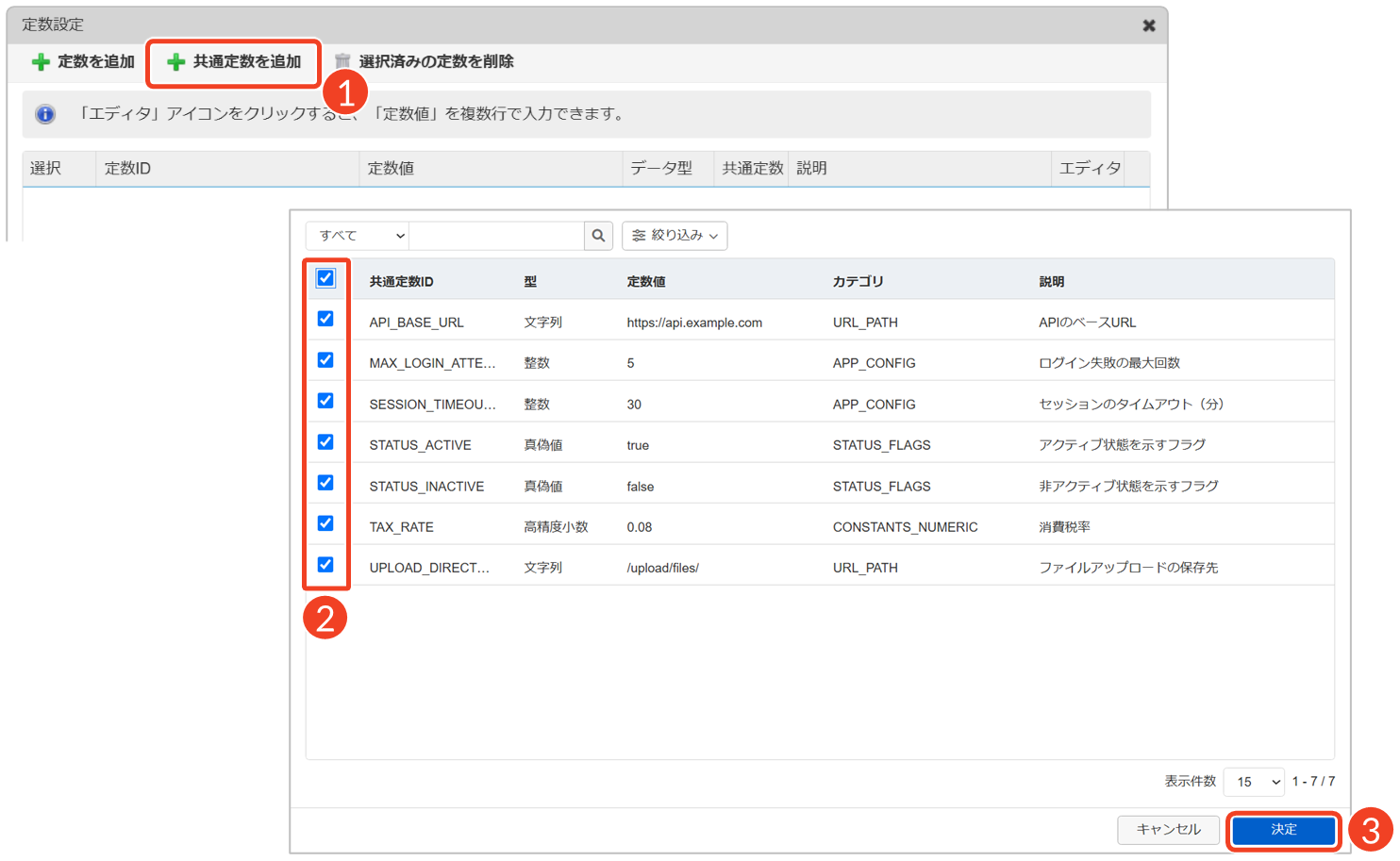 └ 「共通定数定義」画面が表示されます。 - 使用したい共通定数にチェックを入れます。