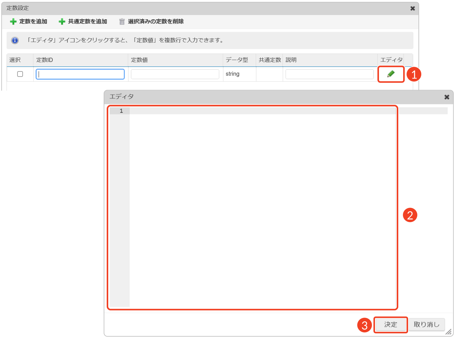 「エディタ」ダイアログでは、複数行の定数値や文字数の多い定数値を、可読性を保ちながら効率的に設定できます。定数値のテキストボックスでは入力しにくい内容も、エディタを使うことでスムーズに編集できます。以下は、エディタの利用が適している例です。