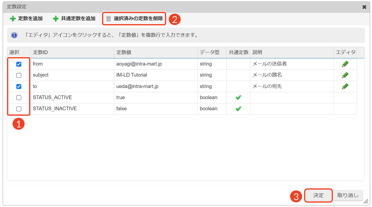 定数を削除した後は、必ず最後に[決定]をクリックして、変更を確定してください。