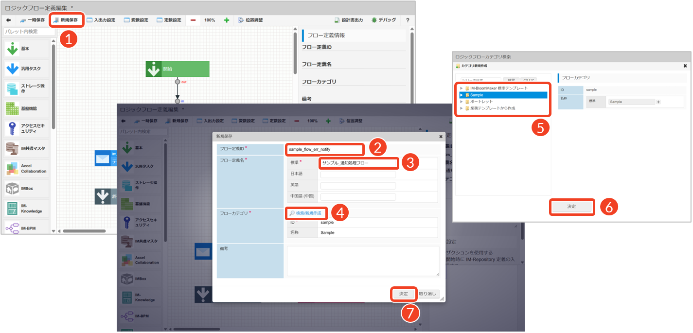 └ 「新規保存」ダイアログが表示されます。 - 「フロー定義ID」に、任意のIDを入力します。
