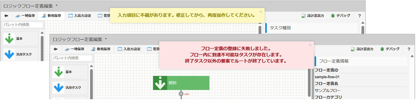 ロジックフローの保存時、設定に不備があると画面上にエラーメッセージが表示され、保存処理が中断されます。