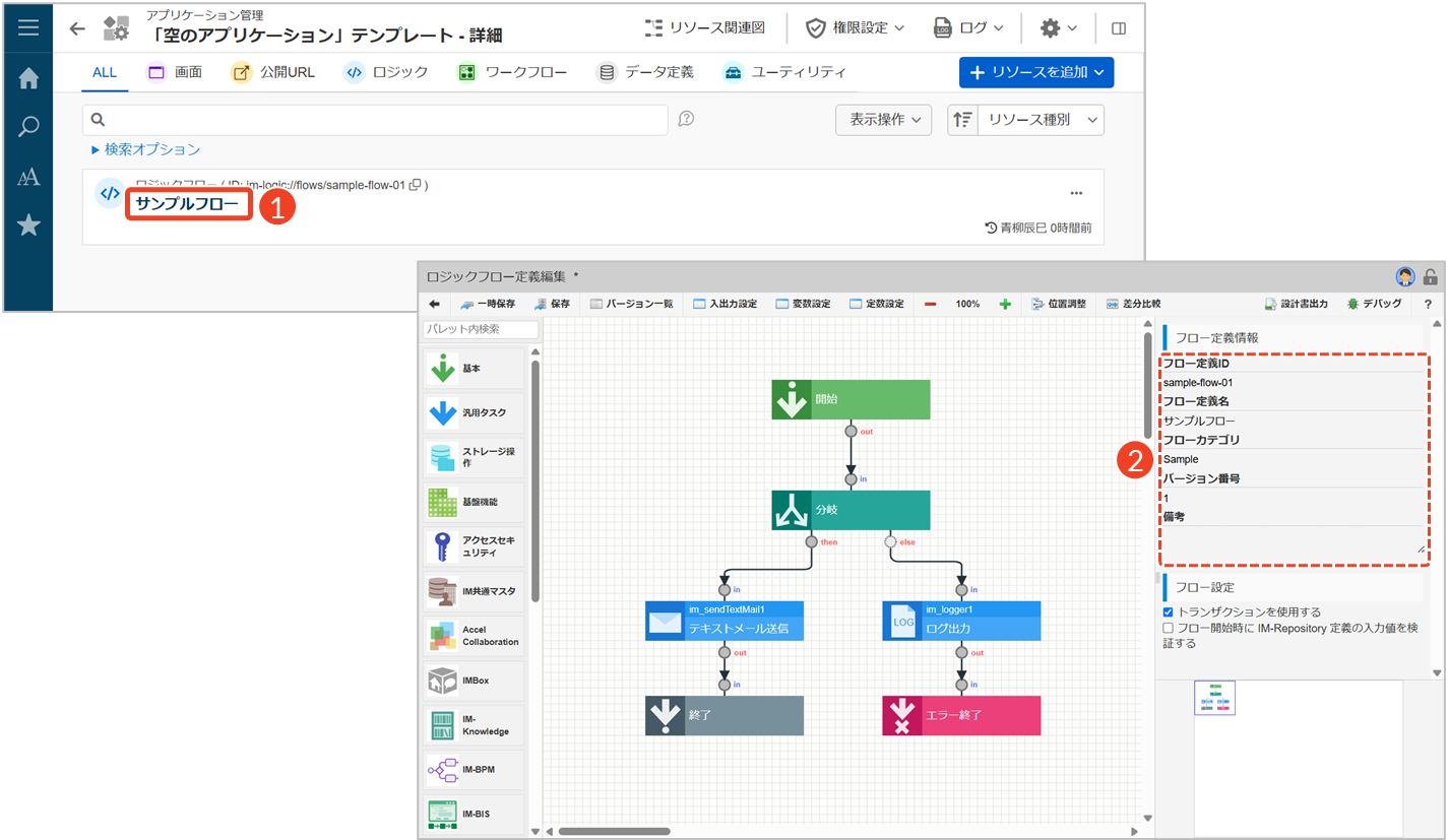 └ 「ロジックフロー定義編集」画面が表示されます。 - 「フロー定義情報」にIDや名称、カテゴリなどの情報が表示されていることを確認します。