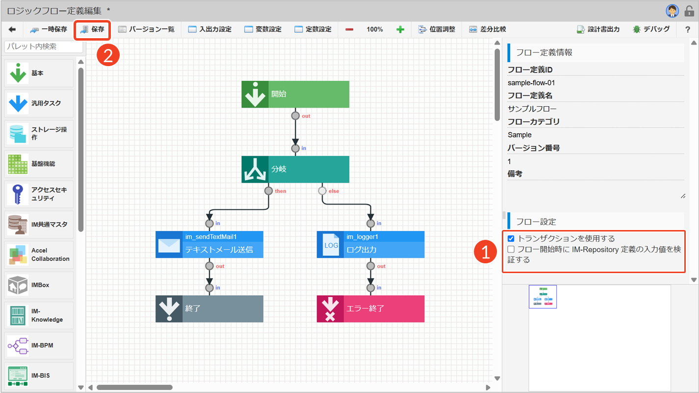 「フロー開始時にIM-Repository定義の入力値を検証する」にチェックを入れると、フロー開始時に入力値が制約を満たすかどうかを検証します。詳細は「IM-LogicDesigner仕様書 - 4.1.6.2. フロー開始時におけるIM-Repository定義の入力値の検証」を参照してください。
