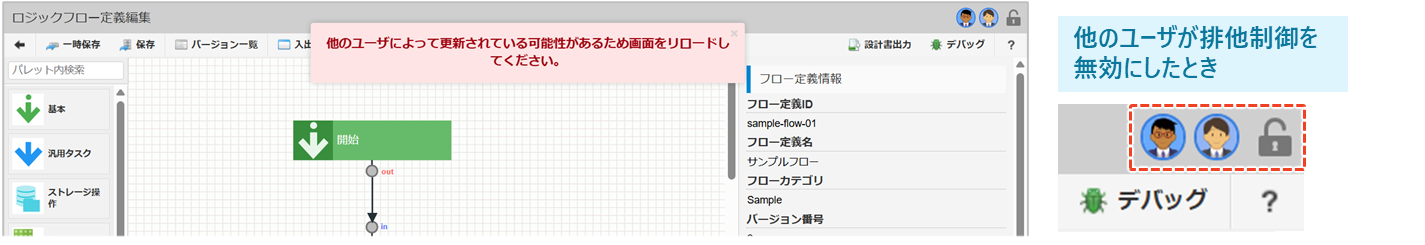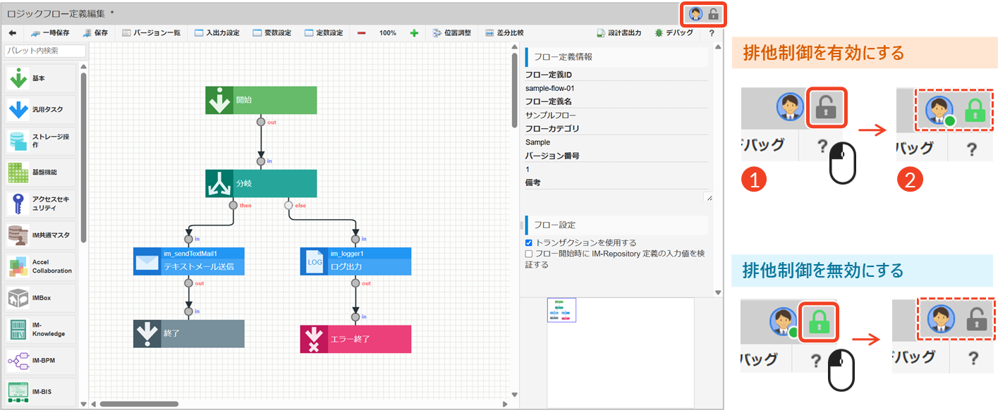 複数人で開発を行う場合、ロジックフロー定義の「排他制御」機能を利用すると便利です。この機能を有効にすることで、複数ユーザによる同時編集や意図しない変更の上書き保存を防ぐことができます。