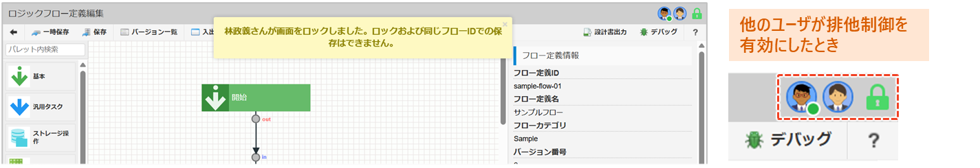 編集中のロジックフローに対して他のユーザが排他制御を有効にした場合、画面上に通知メッセージが表示され、どのユーザがロックを取得したかを確認できます。また、南京錠アイコンが緑色に変化し、ロックを取得したユーザのアイコンに緑色のバッジが表示されます。