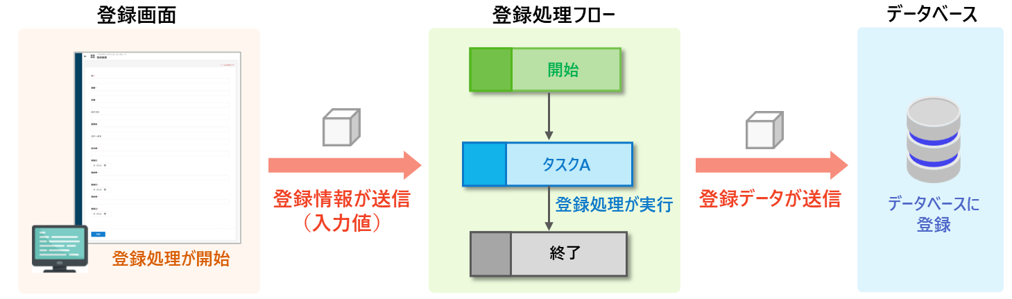 登録処理の基本は、画面から入力されたデータをマスタ情報(データベース)に登録することです。画面の入力項目とロジックフローを通して、データベースとどのように連携するかを確認していきましょう。