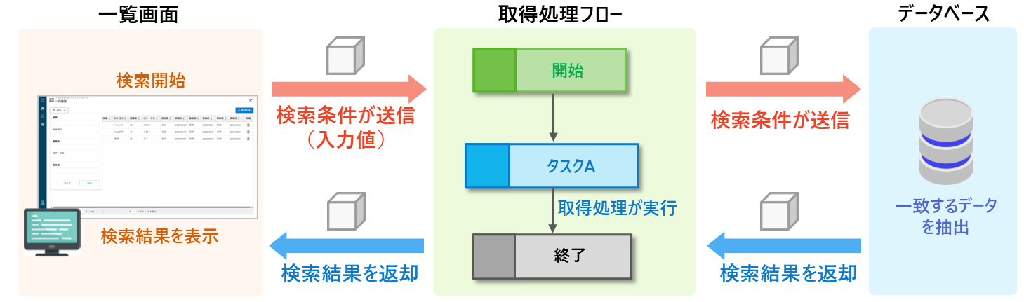 取得処理の基本は、データベースから必要なデータを抽出し、画面上にリスト形式で表示することです。ロジックフローを確認しながら、データベースの項目と画面に表示する項目の対応関係を確認していきましょう。
