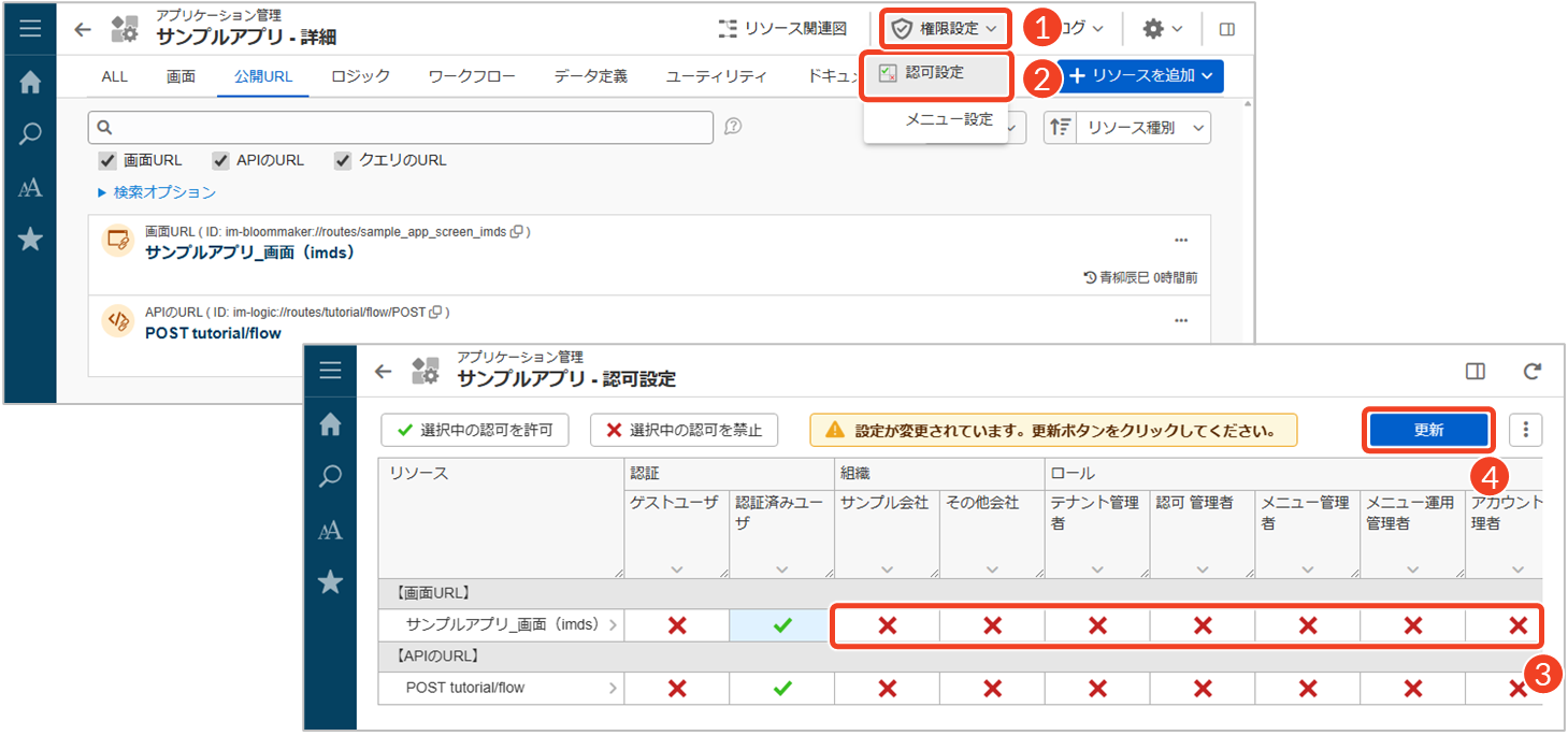 └ 「アプリケーション認可変更確認」ダイアログで[更新]をクリックします。
