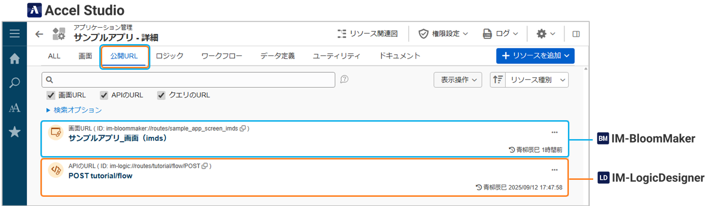 Accel Studioにおける「公開URL」リソースとは、ロジックフローに紐づけてAPIとして公開するためのURLや、作成した画面を呼び出すためのURLなどのリソースを管理するカテゴリのことです。リソースをアプリケーションに追加することで、自動的に関連付けが行われ、アプリケーション内で利用できるようになります。