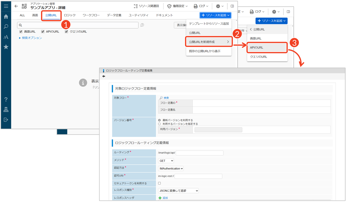 「公開URL」リソースにロジックフローのルーティング定義を追加する際の基本的な操作について説明します。