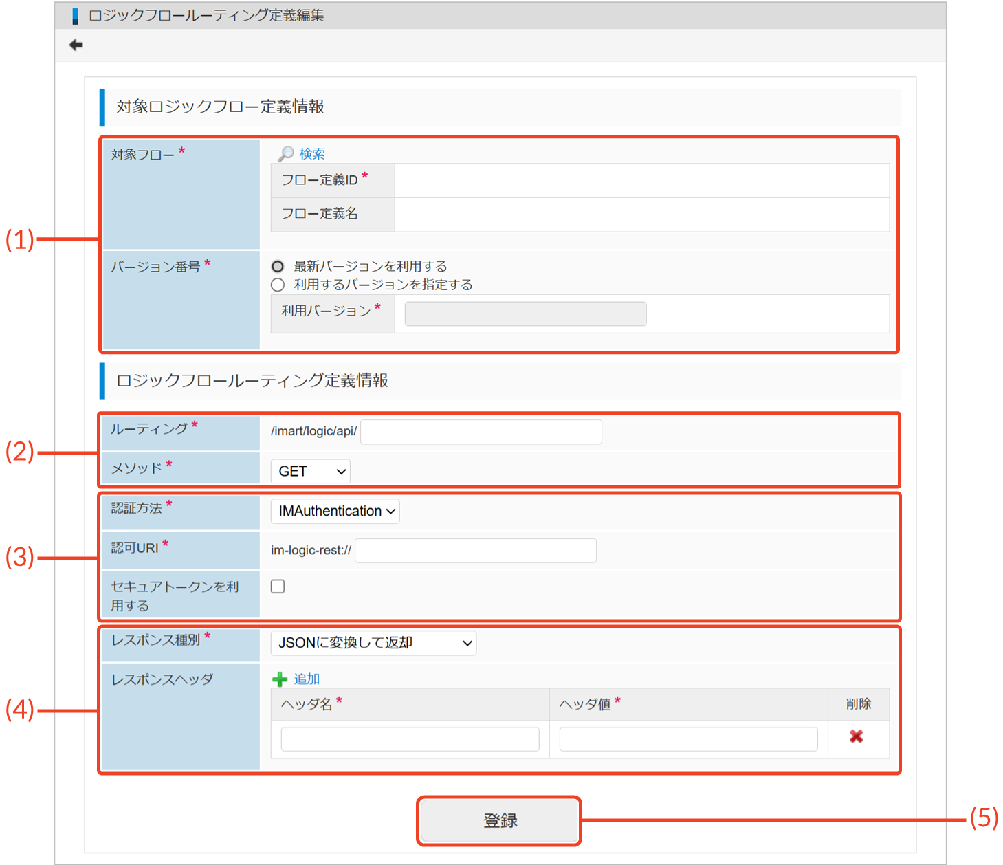 | (1) | 対象フロー定義情報 | 対象フロー | REST APIとして利用したいロジックフローを設定します。 |