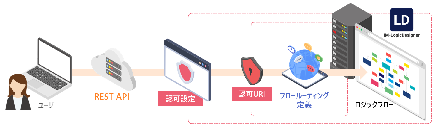 フロールーティング定義の認可とは、ロジックフローにアクセスできるユーザを制御する仕組みです。具体的には、フローを呼び出す入り口であるURIにアクセスした際に、ユーザが実行権限を持っているかどうかをチェックします。