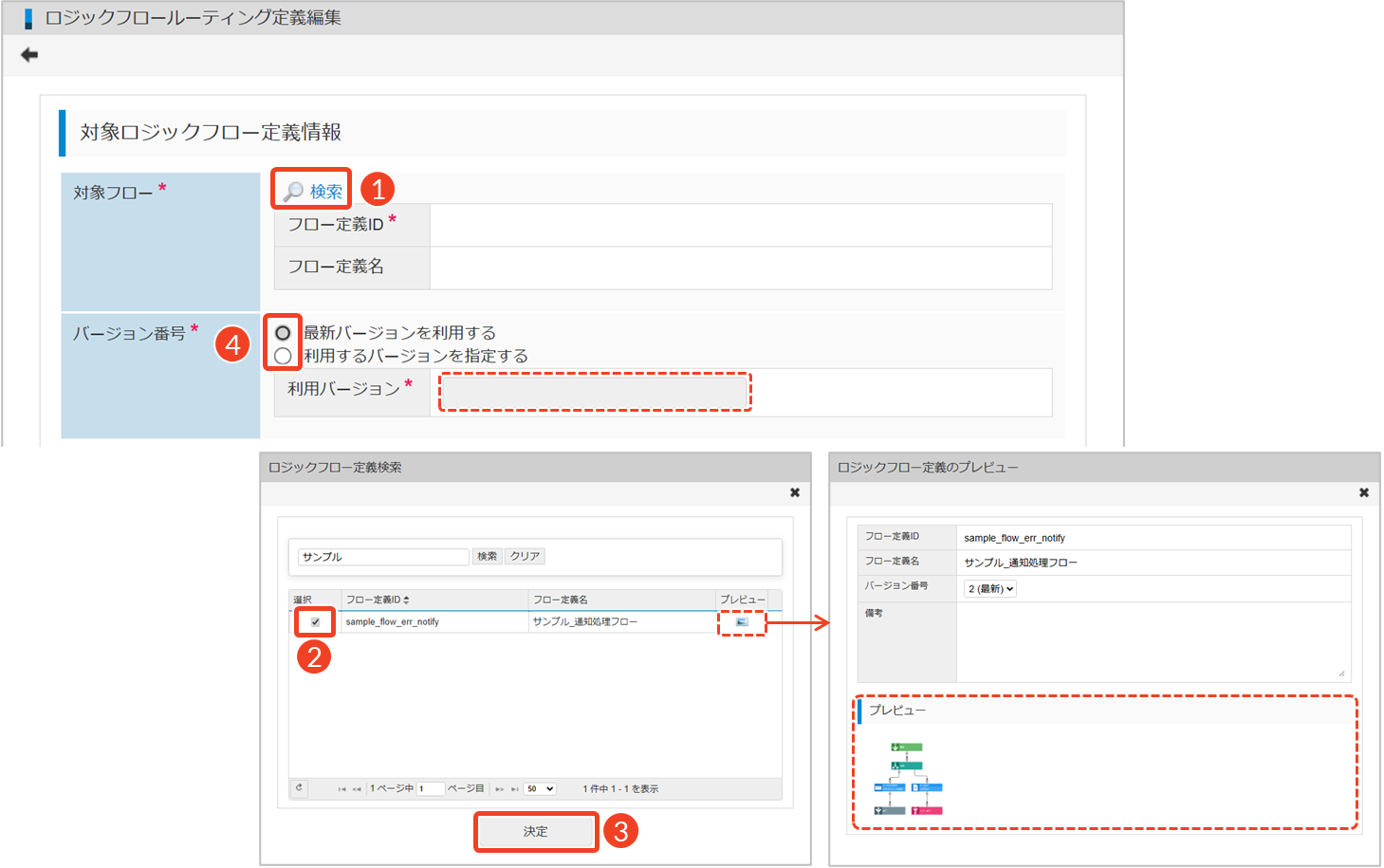 └ 「ロジックフロー定義検索」画面が閉じます。- 「対象フロー」に設定したロジックフローのバージョン番号を指定します。