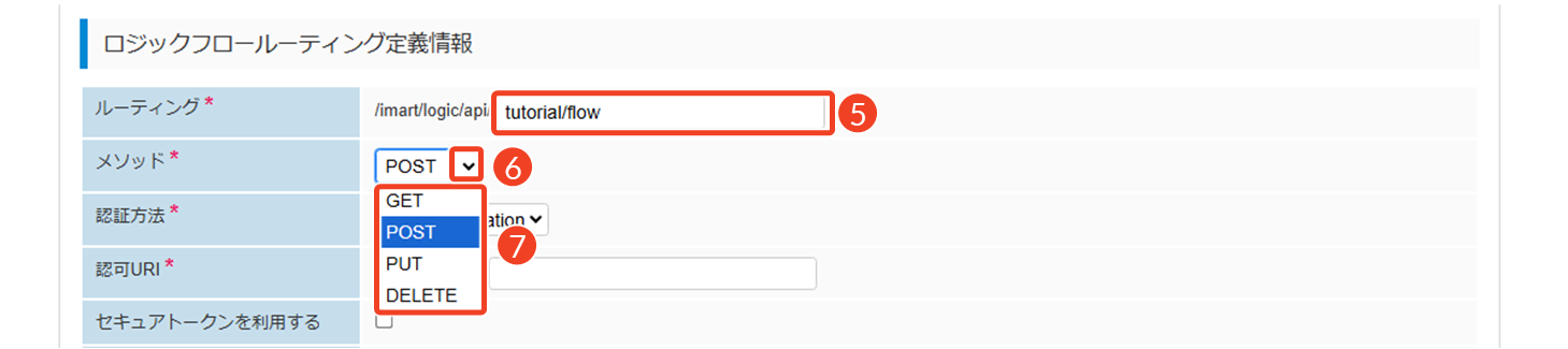 ルーティングURLを設定し、フローの用途に応じてHTTPメソッドを選択します。