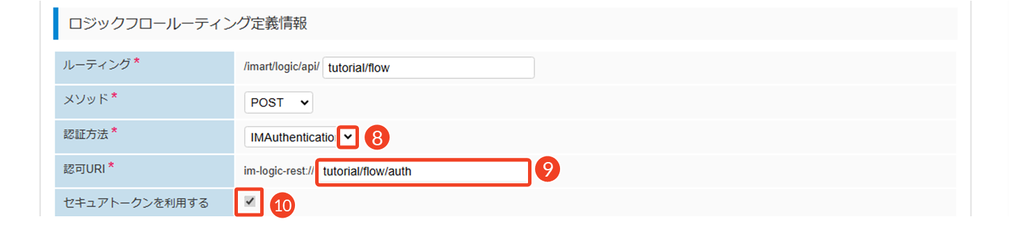 フロールーティングの設定では、ロジックフローを安全に呼び出すために次のような認可設定を行います。