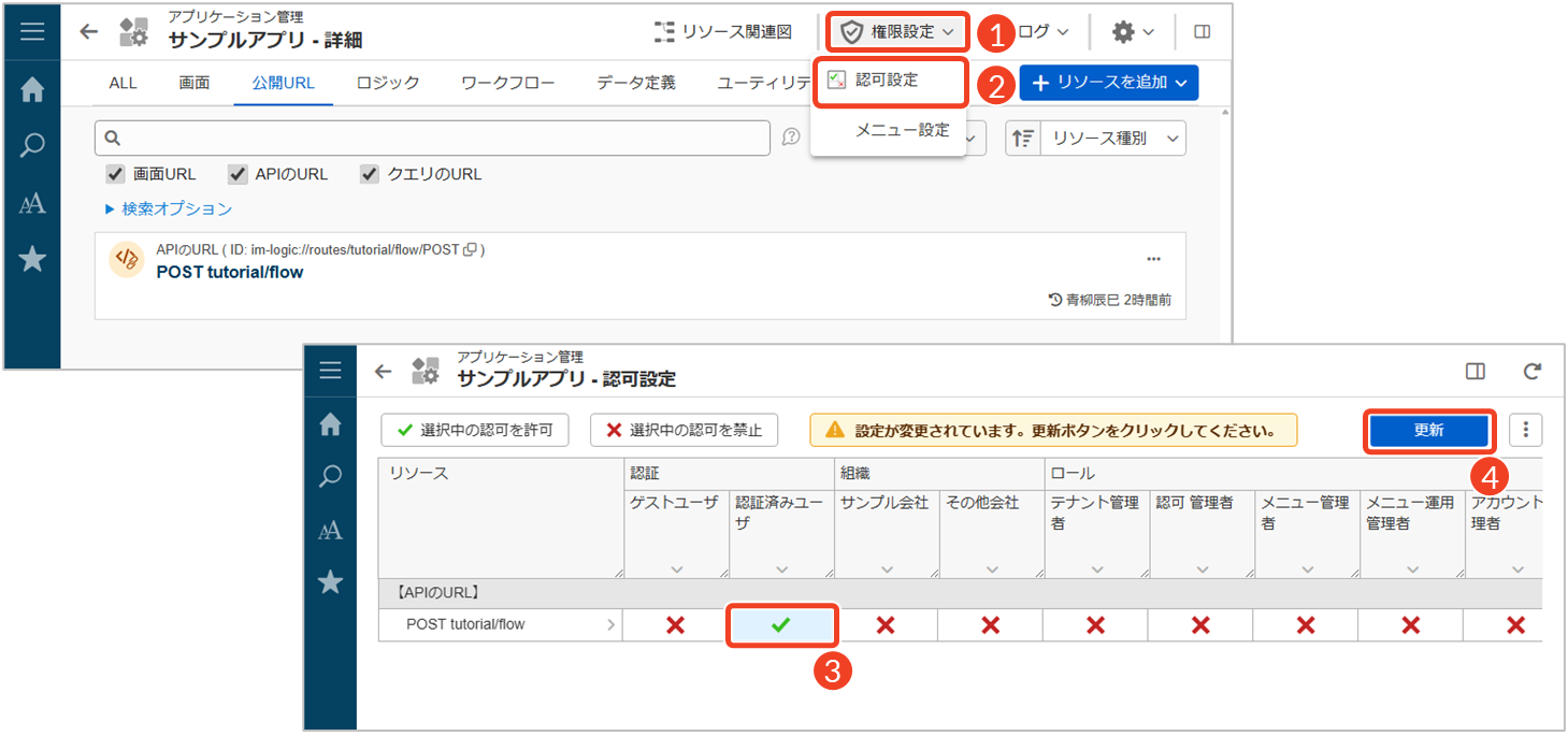 REST APIのURLに対して、フローを実行する側のユーザがアクセスできるかどうかを判定するために認可設定を行います。