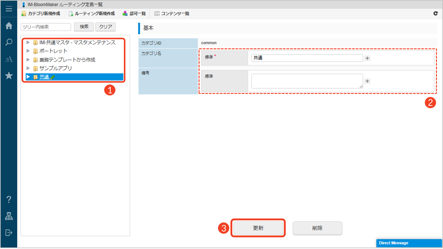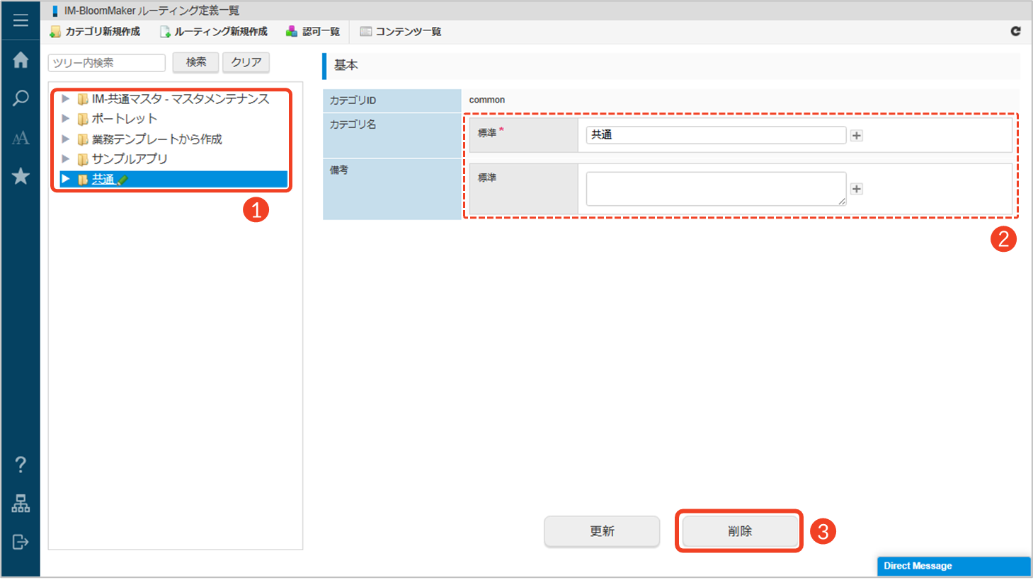 - 親カテゴリに子カテゴリやルーティング定義が含まれている場合は、それらを先に削除しないと親カテゴリを削除できません。ルーティングの削除手順は、「ルーティング定義を削除する」を参照してください。
