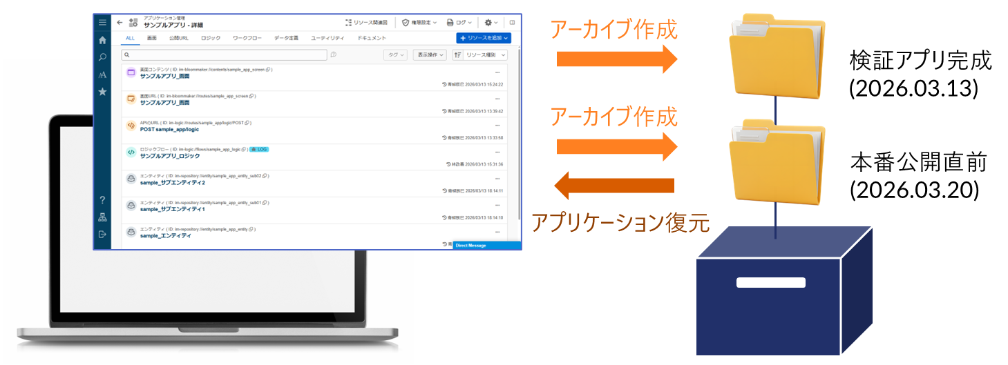 Accel Studioのアーカイブ機能は、アプリケーションの現状(構成情報やリソース状態)をスナップショットとして保存し、任意のタイミングで保存したアーカイブを利用することで、過去のアプリケーション状態に復元できる機能です。この機能を使うことで、改修前の状態を保存したり、公開前の状態に戻したりすることが可能です。