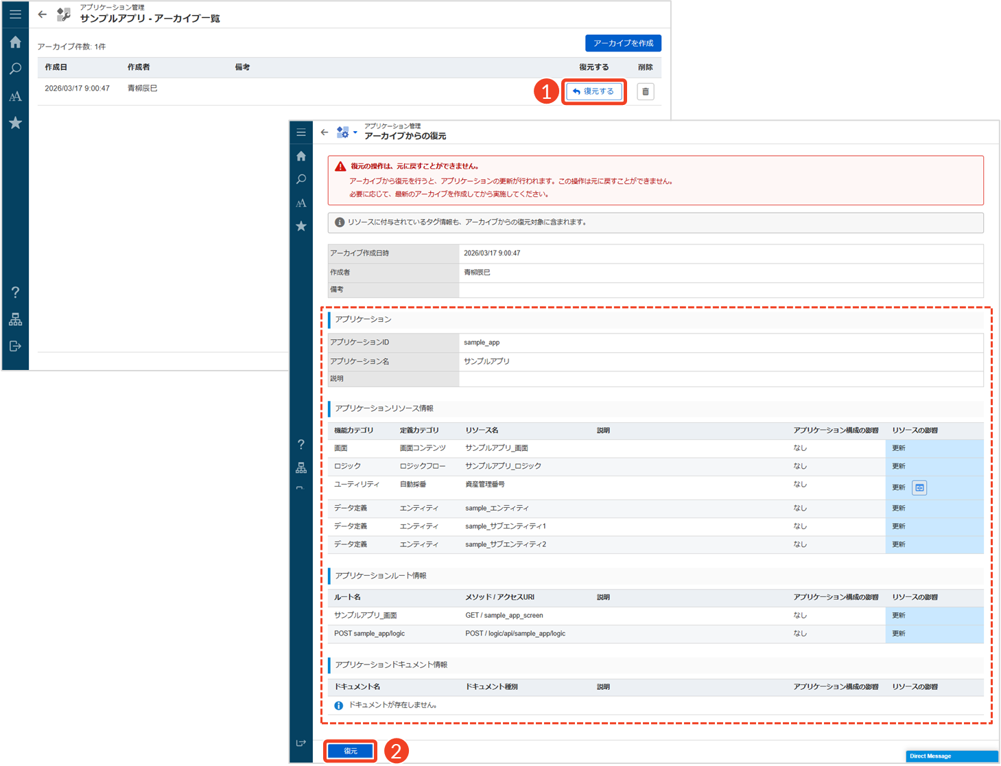 アプリケーションの復元操作は元に戻すことができません。アーカイブから復元すると、アプリケーションはアーカイブ取得時点の状態に更新されます。必要に応じて、操作を実施する前に最新のアーカイブを作成しておくことを推奨します。