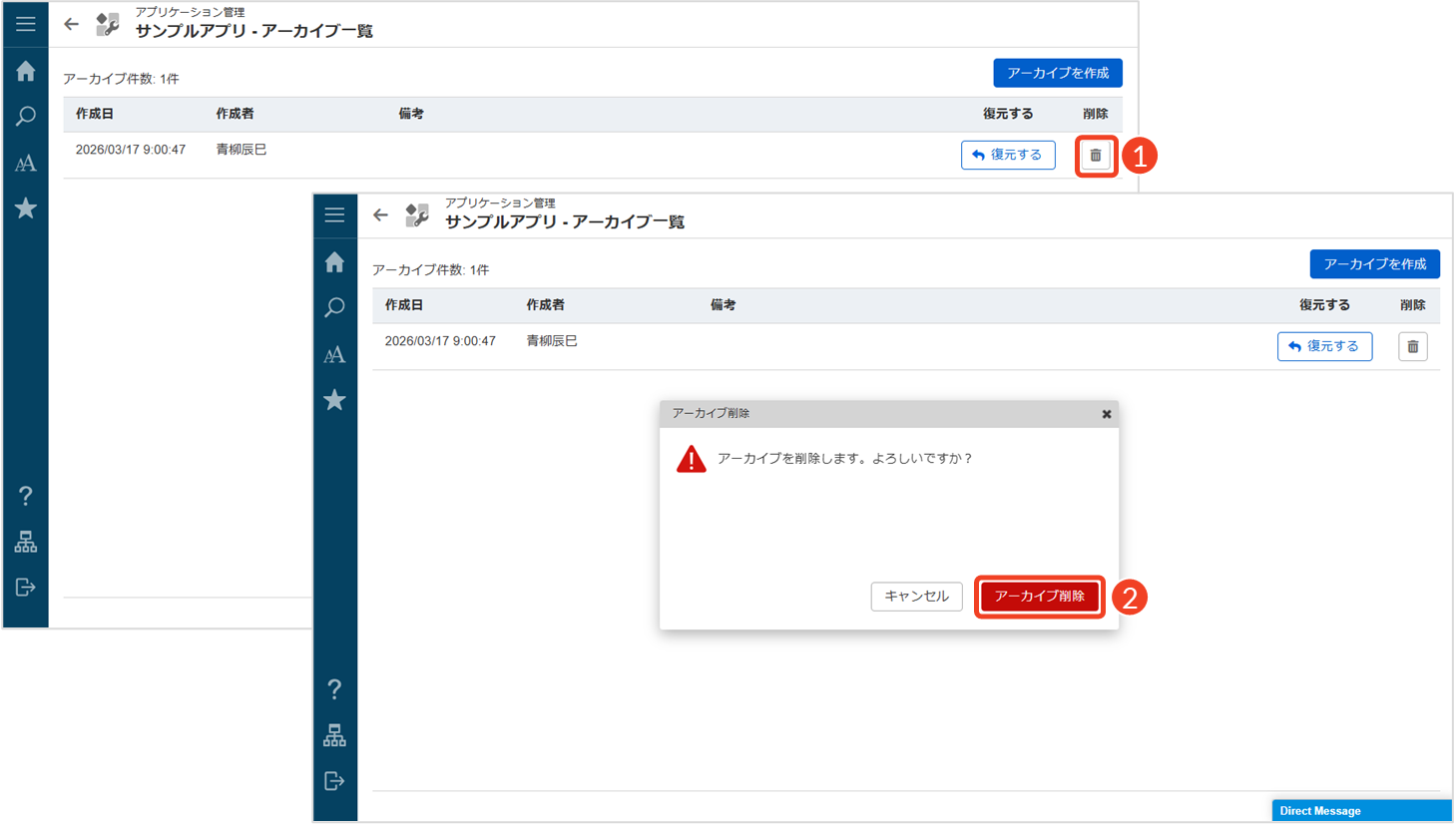└ 「アーカイブ削除」ダイアログが表示されます。 - [アーカイブ削除]をクリックします。