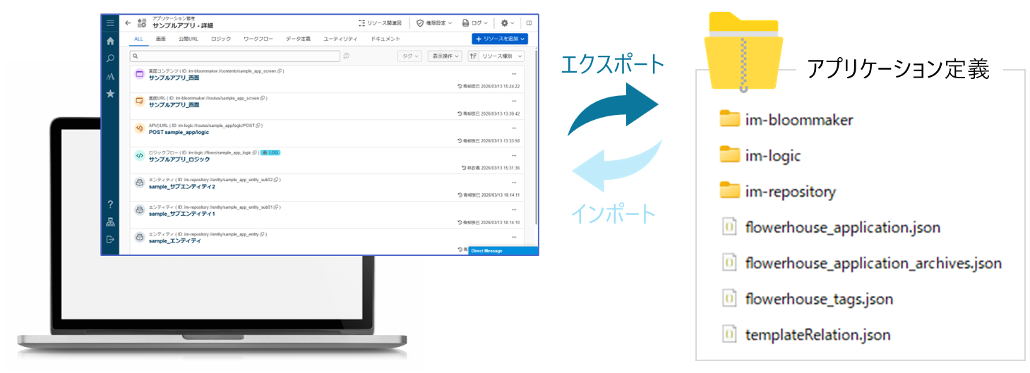 | リソース情報 | 「im-bloommaker」フォルダ 「im-logic」フォルダ 「im-repository」フォルダ | ローコード製品別にエクスポートされたローコード資材 (ファイル形式やフォーマットは資材の種類により異なる) |