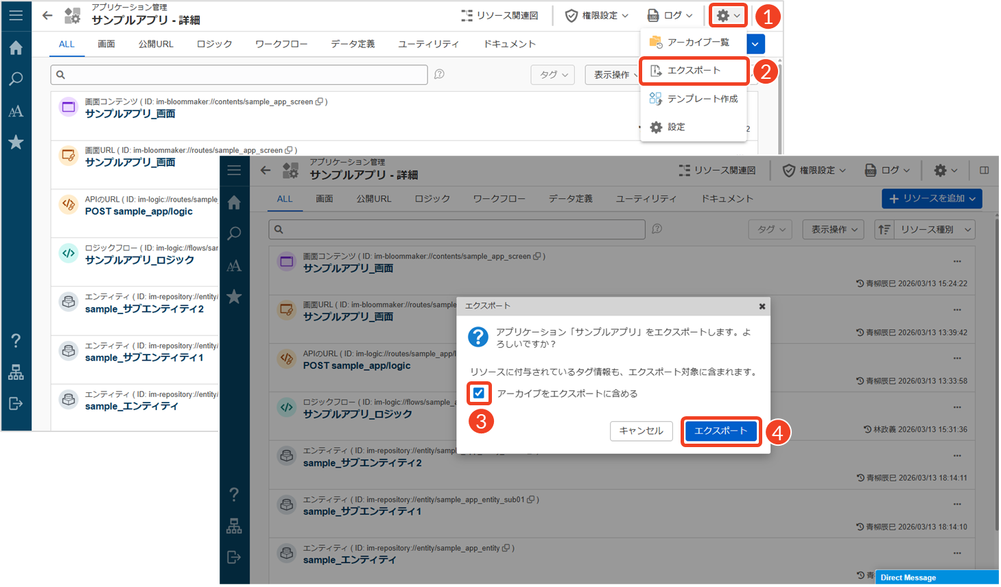 アプリケーションのエクスポートに関する基本的な操作について説明します。