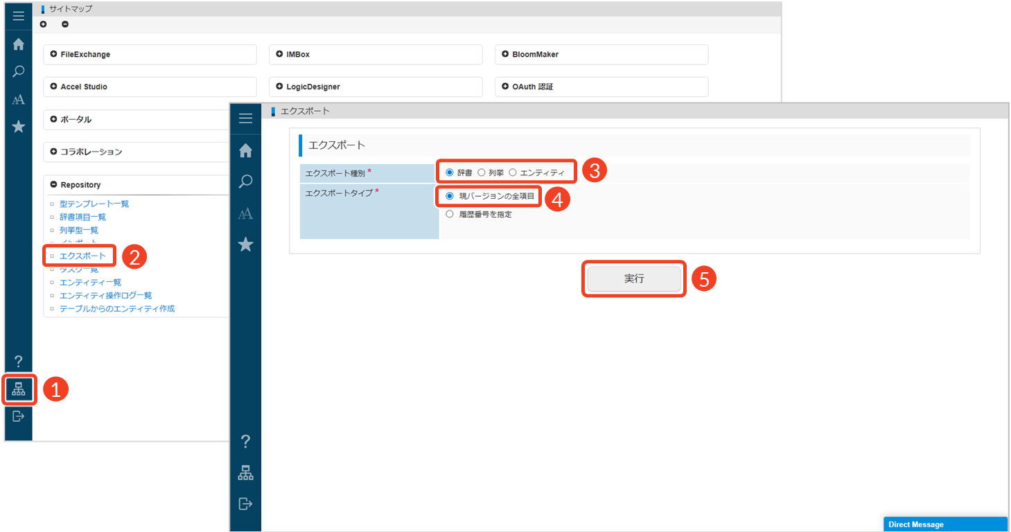 └ エンティティ:エンティティ定義をエクスポートしたい場合 - 「エクスポート種別」で「辞書」を選択した場合は、「エクスポートタイプ」で「現バージョンの全項目」を選択します。