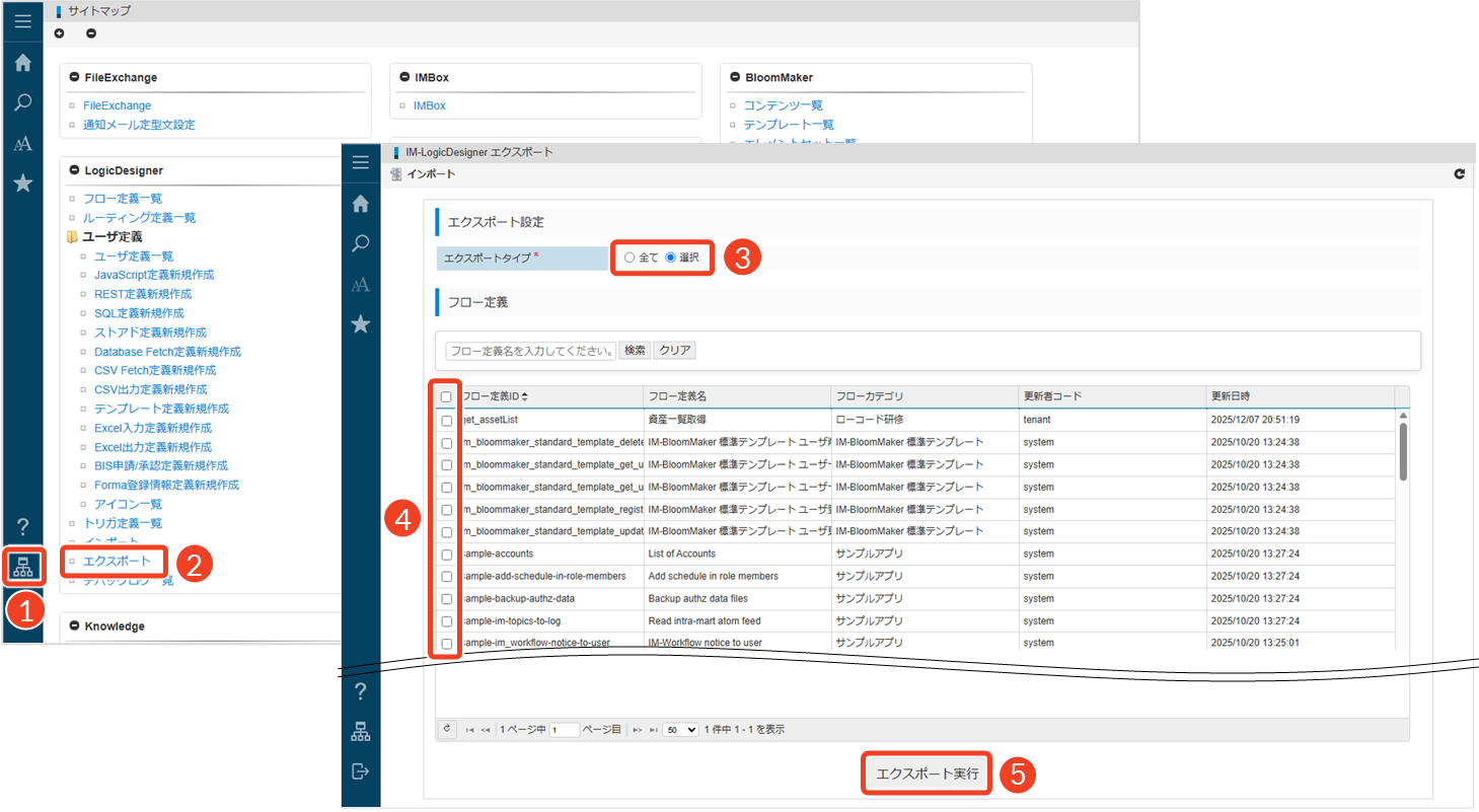 IM-LogicDesignerのエクスポート機能は、ロジックフロー(ロジック定義)を別環境へ移行したり、バックアップや共有を行ったりしたい場合に適しています。ただし、データベースのテーブル定義やコンテンツ定義など、フローに関連する設定は出力されないため、移行後は必要なリソースを確認しながら設定し直してください。