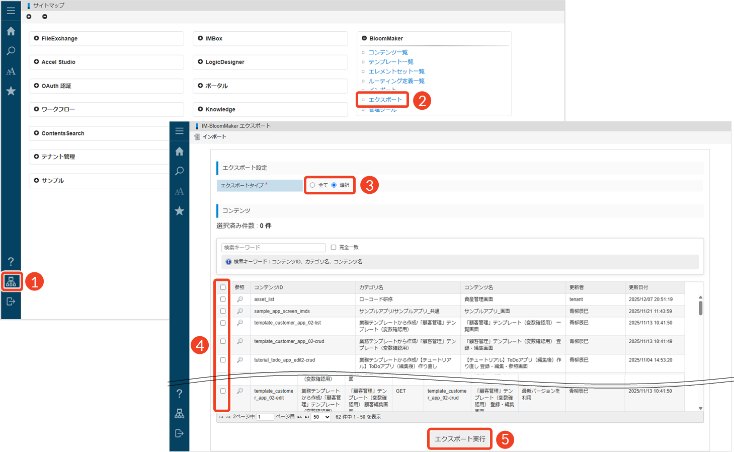 └ 「サイトマップ」画面が表示されます。 - 「BloomMaker」にある[エクスポート]をクリックします。