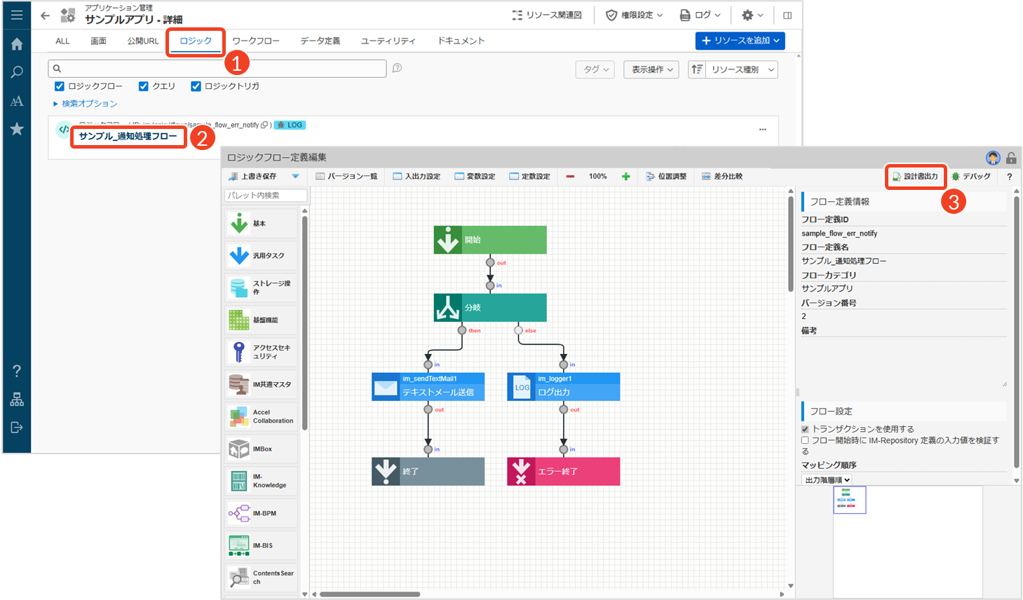 └ 「ロジックフロー定義編集」画面が表示されます。 - [設計書出力]をクリックします。