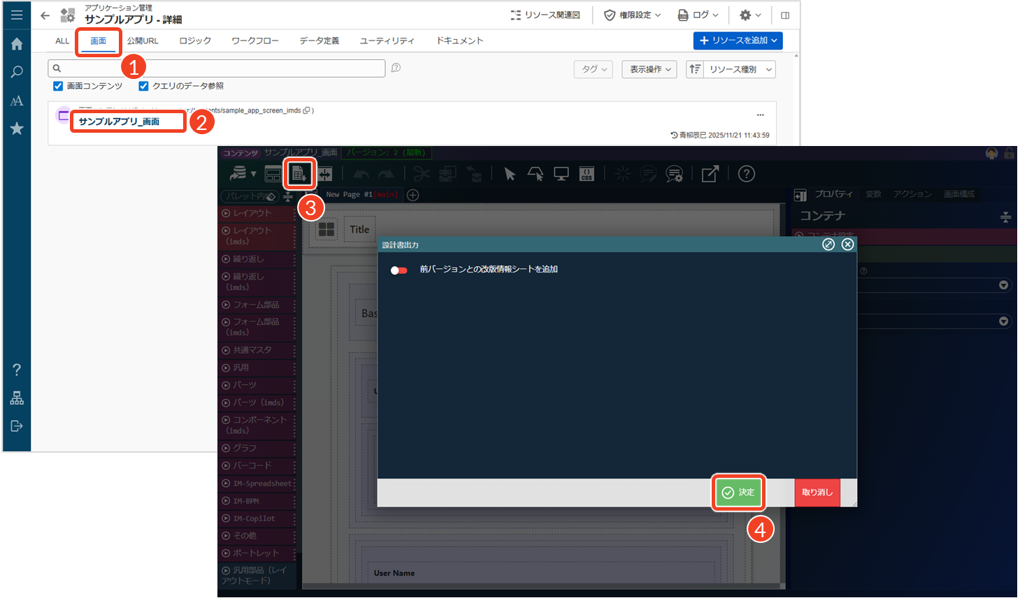 ロジックフローと画面コンテンツの設計書出力に関する基本的な操作について説明します。