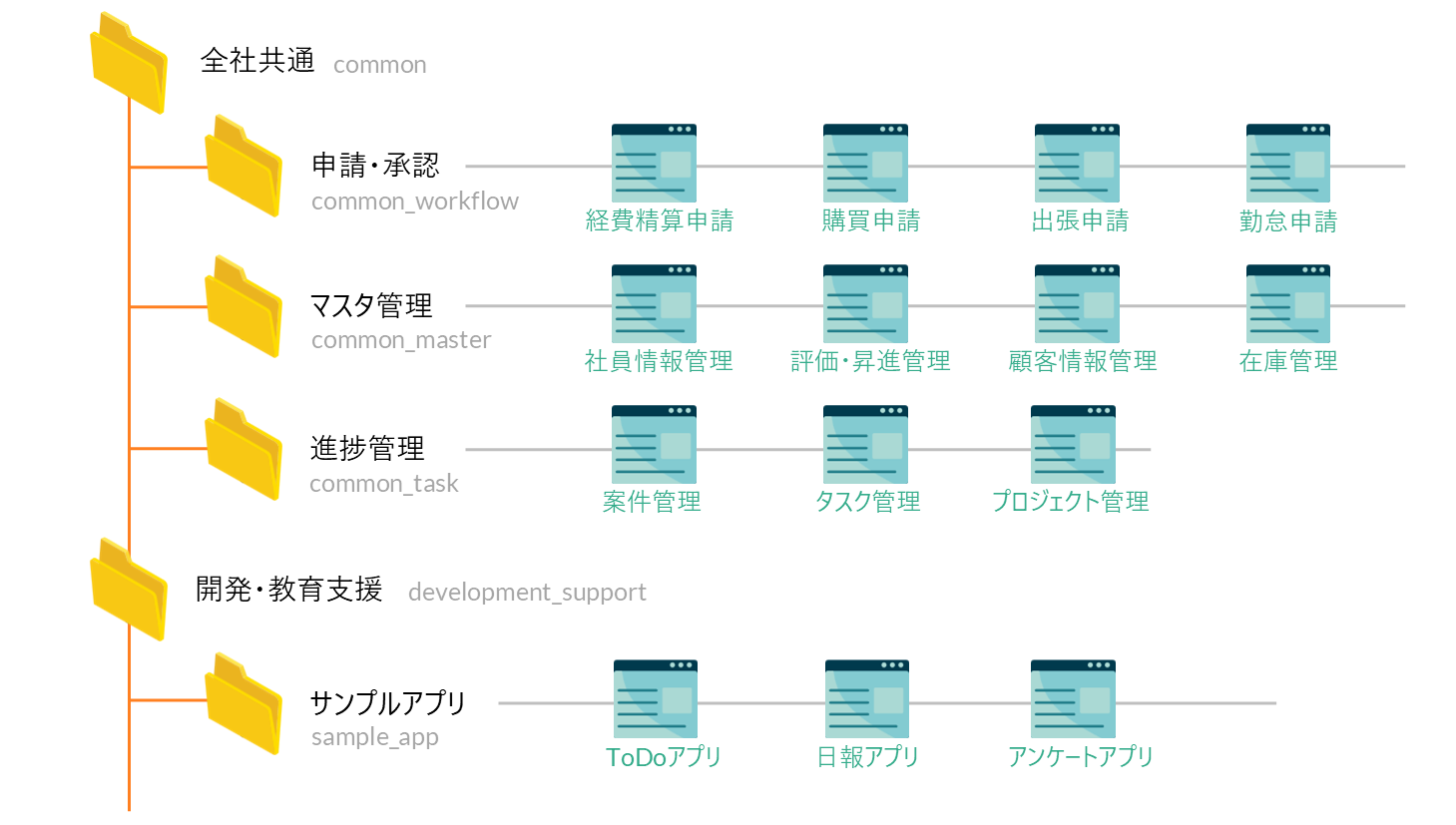 アプリケーションカテゴリは、アプリケーションの用途や適用範囲に応じて分類するための情報です。「開発・教育支援」カテゴリの配下に作成していた検証アプリを、「全社共通」カテゴリへ移動し、業務用アプリとして公開することを想定した例を紹介します。