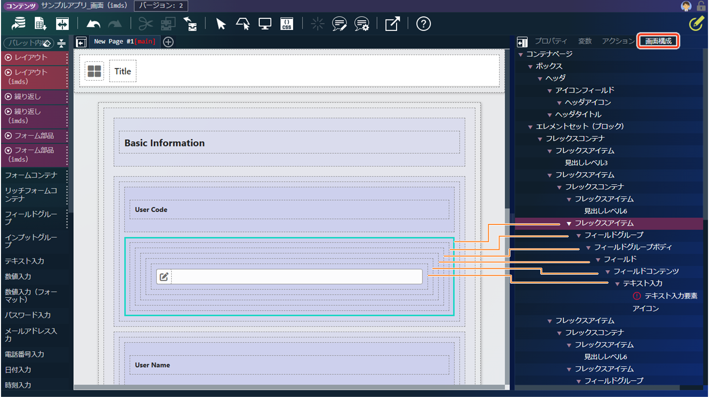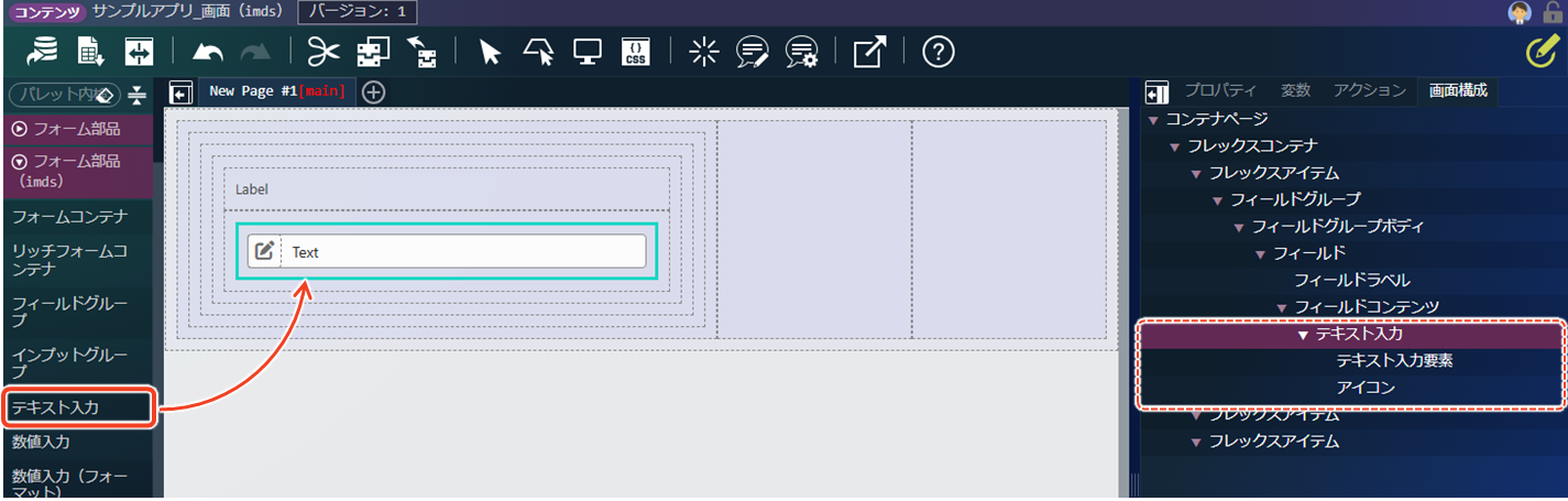 最後に、「フィールドコンテンツ」に「フォーム部品(imds)」の「テキスト入力」を配置します。「テキスト入力」には、「テキスト入力要素」と「アイコン」という子要素が含まれています。