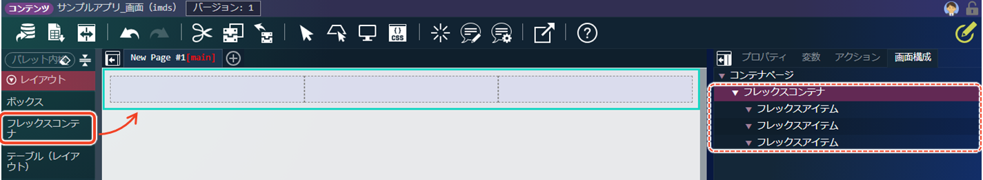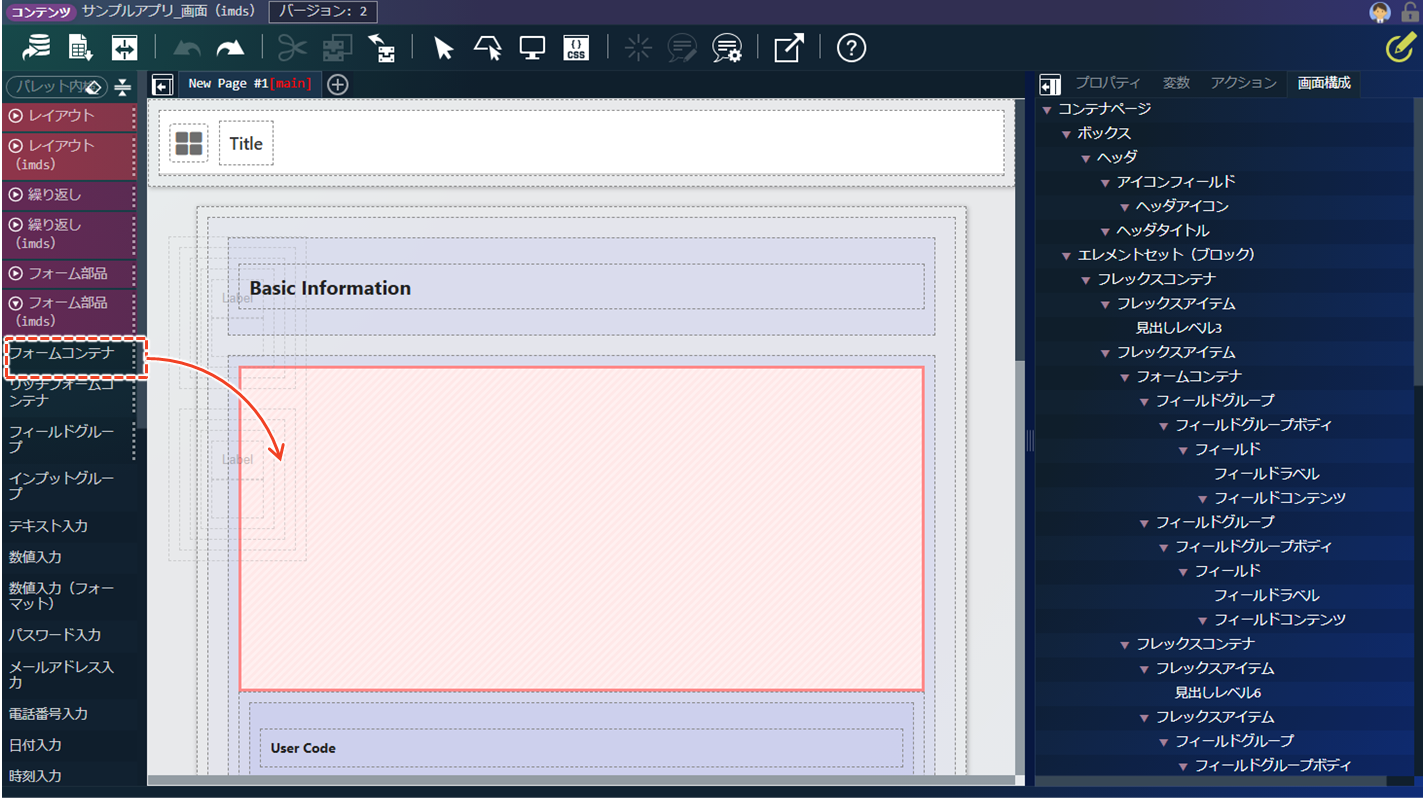 └ 「Main Page」コンテナヘッダをクリックします。 - パレットから「パーツ」にある「コンテナページ埋め込み」をメインコンテナページにドラッグします。