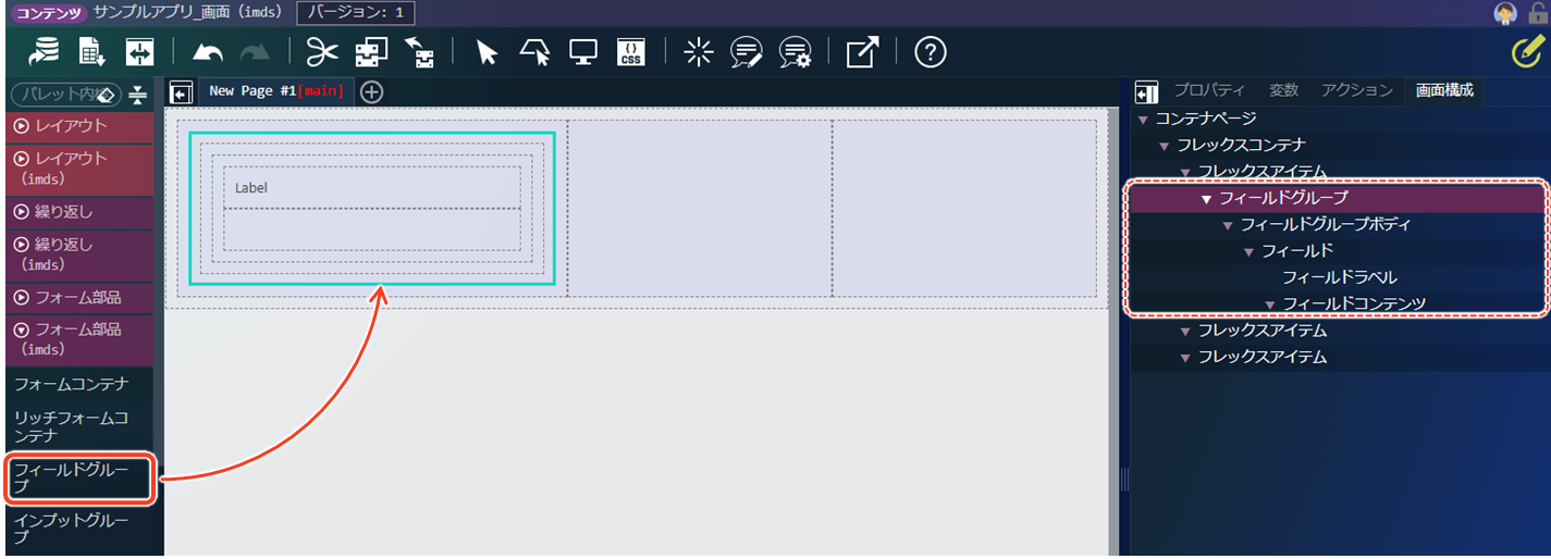 次に、「フレックスアイテム」に「フォーム部品(imds)」の「フィールドグループ」を配置します。「フィールドグループ」には、ラベルを表示する「フィールドラベル」と入力フォームを配置する「フィールドコンテンツ」という子要素が含まれています。「フィールドグループボディ」はこの2つの子要素をグループ化したものです。