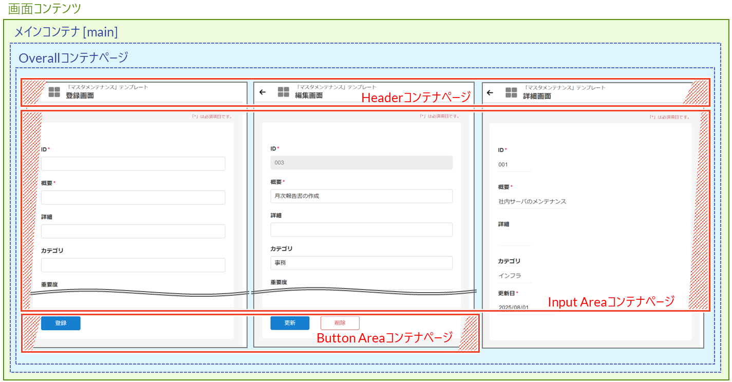 たとえば、「マスタメンテナンス」テンプレートでは、登録・編集・参照画面を1つのコンテンツ内にまとめて作成しています。類似する要素をコンテナページ単位で定義しておくことで、定数や変数の設定に応じて表示画面を切り替えることができます。