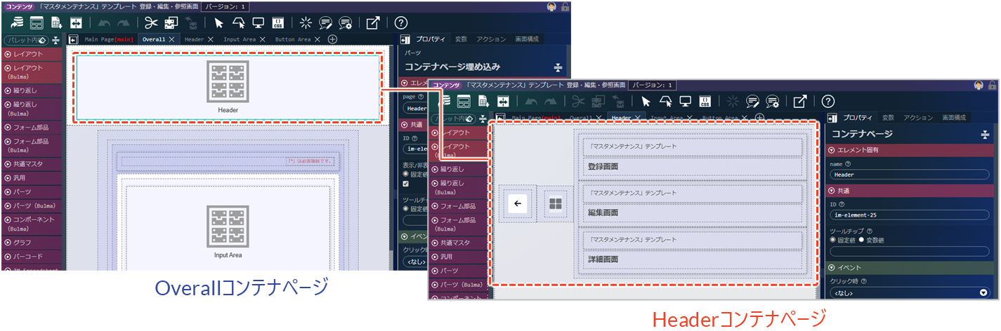 「Header」に着目すると、「Overall」コンテナページ内に「Header」コンテナページを埋め込むエレメントが配置されていることが確認できます。「Header」には、登録・編集・参照画面のヘッダが配置されています。これにより、複数の画面で共通デザインのヘッダを利用でき、保守性や一貫性が向上します。
