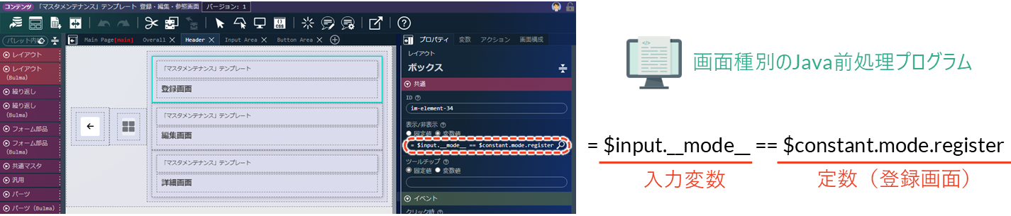 「マスタメンテナンス」テンプレートでは、登録・編集・参照画面といった画面種別をJava前処理プログラムで判別しています。各ヘッダのプロパティにある「表示/非表示」の設定には、次のような条件式が指定されています。