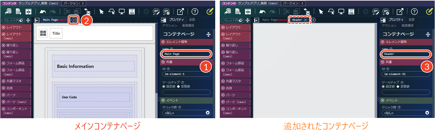 共通パーツやレイアウトを複数画面で使う場合、コンテナページ単位で扱うと効率的です。 - プロパティやイベントの制御がしやすい:
