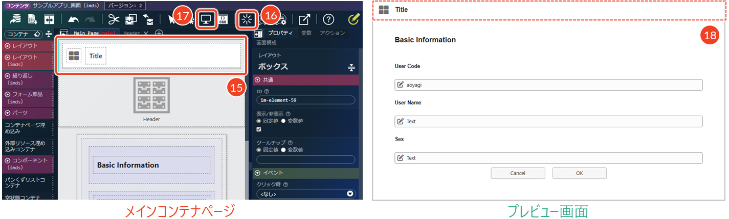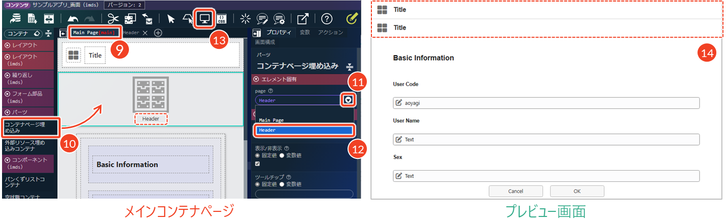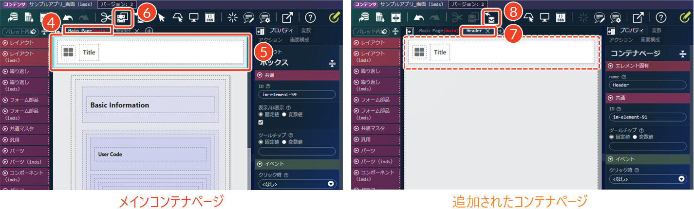 この仕組みにより、コンテナページごとに分けて配置したエレメントを、画面種別に応じて切り替えて表示することが可能になります。IM-BloomMakerの前処理について、詳細は、「Accel Studio テンプレートカタログ - 8.1. IM-BloomMaker前処理」を参照してください。