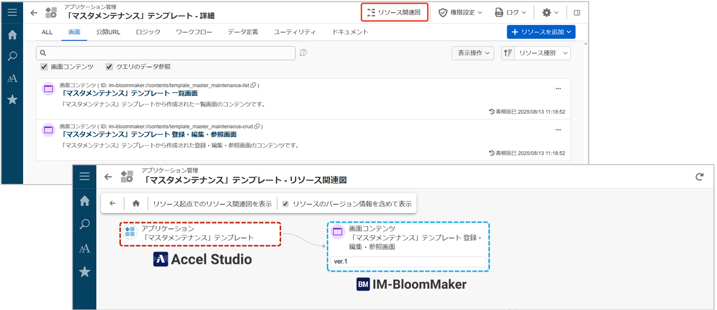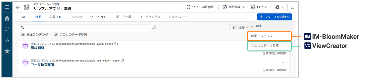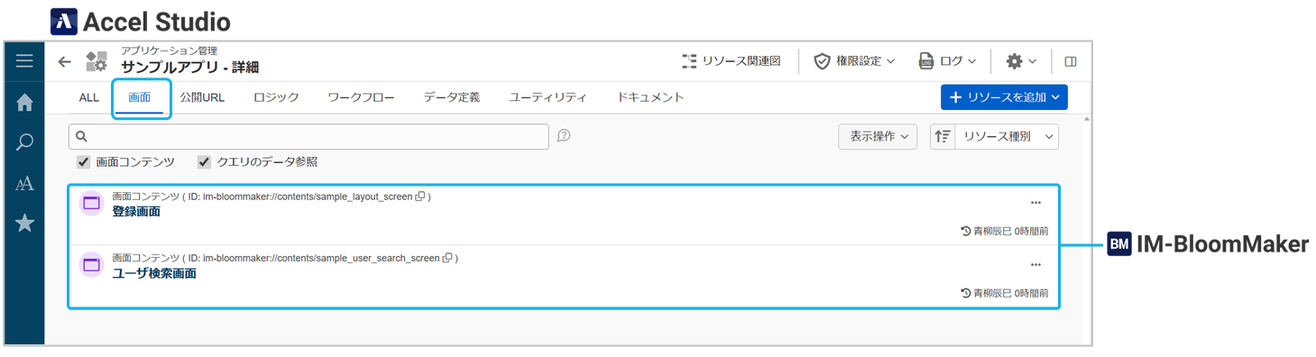 Accel Studioにおける「画面」リソースとは、IM-BloomMakerで定義した画面コンテンツやViewCreatorで定義したデータ参照を管理するカテゴリを指します。リソースをアプリケーションに追加することで、自動的に関連付けが行われ、アプリケーション内で利用できるようになります。